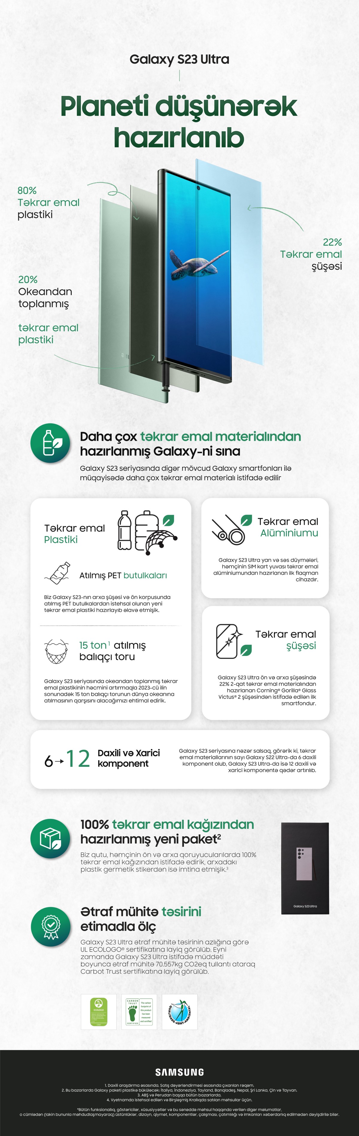 Galaxy S23 seriyası əvvəlki nəsillərə nisbətən ətraf mühitə daha az təsir etməklə həm keyfiyyət, həm də estetika baxımından tələbləri yüksəldir. Buna nail olmaq üçün təkrar emal edilmiş materialları əvvəlki Galaxy smartfonları ilə müqayisədə daha çox komponentə daxil etdik və onun qutusunu 100% təkrar emal edilmiş kağızdan hazırladıq. Galaxy S23 seriyasında təkrar emal edilmiş materialların kütləsi artırılaraq, Galaxy S22 Ultra-da 6 daxili komponentdən Galaxy S23 Ultra-da 12 daxili və xarici komponentə yüksəldilib.