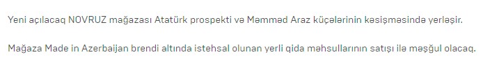 İlk "Novruz" mağazası Bakıda Atatürk prospekti və Məmməd Araz küçələrinin kəsişməsində fəaliyyətə başlayacaqdır.