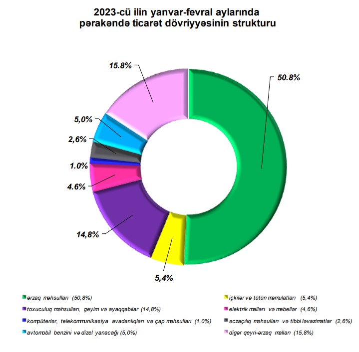 2023-cü ilin yanvar-fevral aylarında alıcıların pərakəndə ticarət şəbəkəsində aldıqları mallara xərclədiyi vəsaitin 50,8 faizi ərzaq məhsullarının, 5,4 faizi içkilər və tütün məmulatlarının, 14,8 faizi toxuculuq məhsulları, geyim və ayaqqabıların, 5,0 faizi avtomobil benzini və dizel yanacağının, 4,6 faizi elektrik malları və mebellərin, 2,6 faizi əczaçılıq məhsulları və tibbi ləvazimatların, 1,0 faizi kompüterlər, telekommunikasiya avadanlıqları və çap məhsullarının, 15,8 faizi isə digər qeyri-ərzaq mallarının alınmasına sərf olunmuşdur.