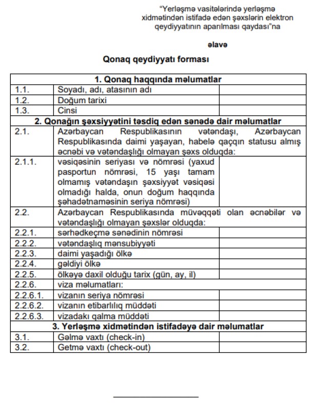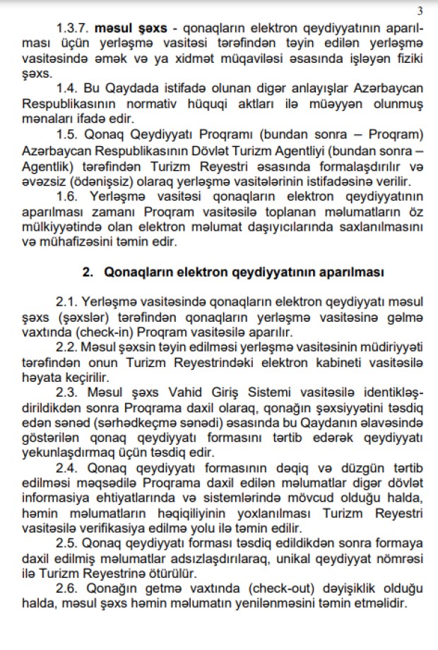 - yerləşmə vasitələrində qalan şəxslərin elektron qeydiyyatı həyata keçirilməklə ölkəyə gələn xarici qonaqların və yerli turistlərin dəqiq statistik hesabatlarının aparılması təmin ediləcək;