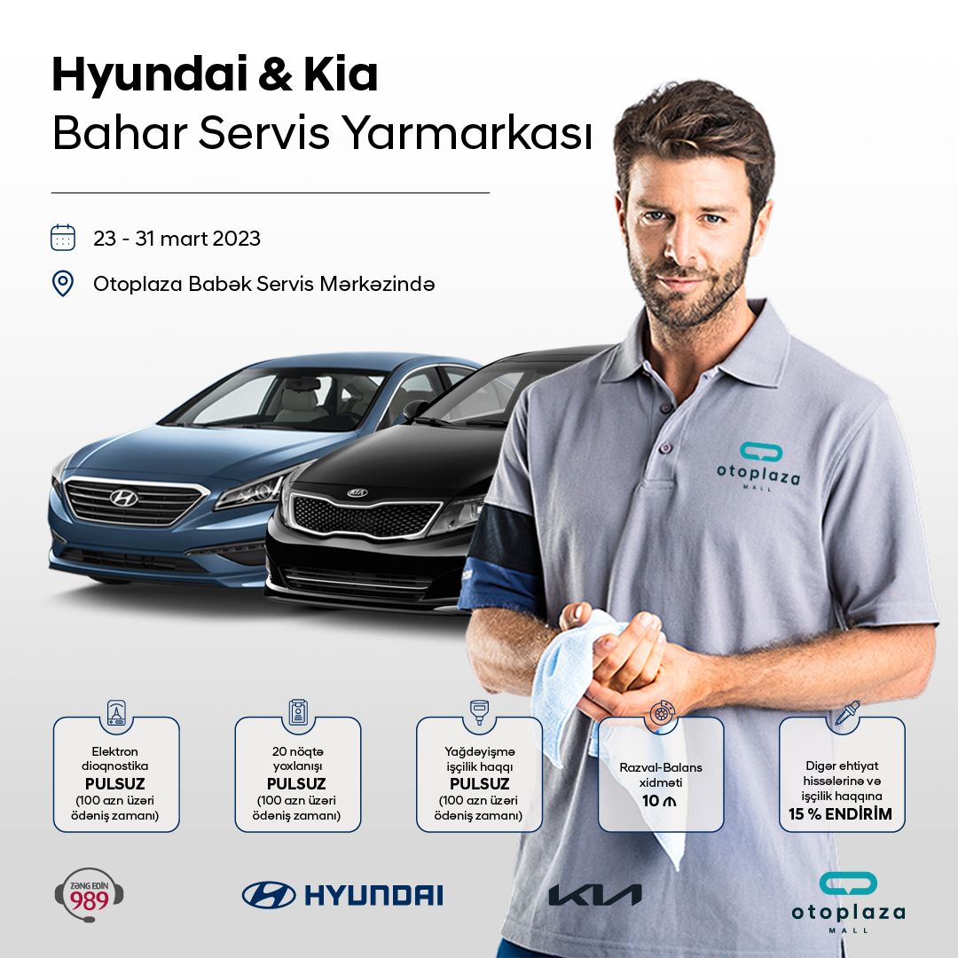Hyundai və Kia avtomobil sahiblərinin nəzərinə"Otoplaza Babək" servis mərkəzində yalnız 1 həftə - mart ayının 23-dən 31 dək Bahar Servis Yarmarkası keçirilir.