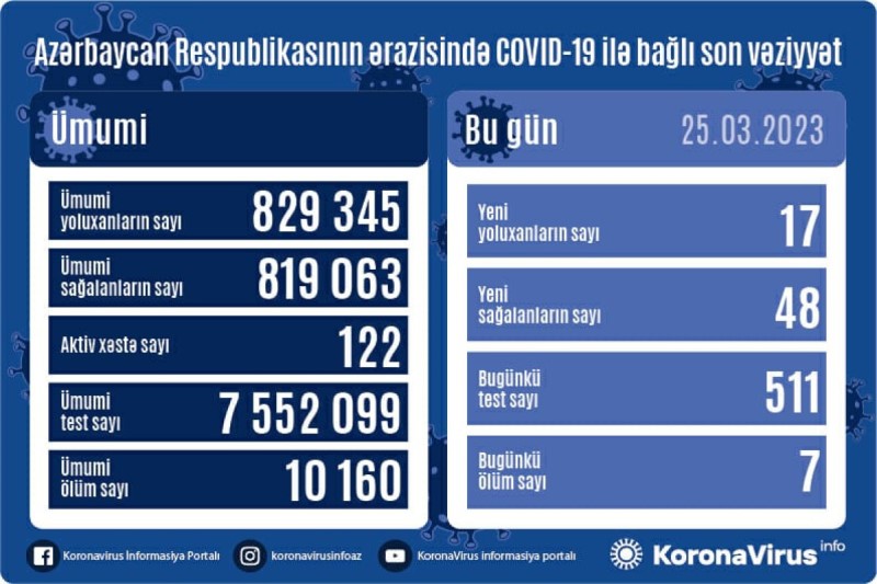 Azərbaycanda koronavirus (COVID-19) infeksiyasına 17 yeni yoluxma faktı qeydə alınıb, 48 nəfər müalicə olunaraq sağalıb.