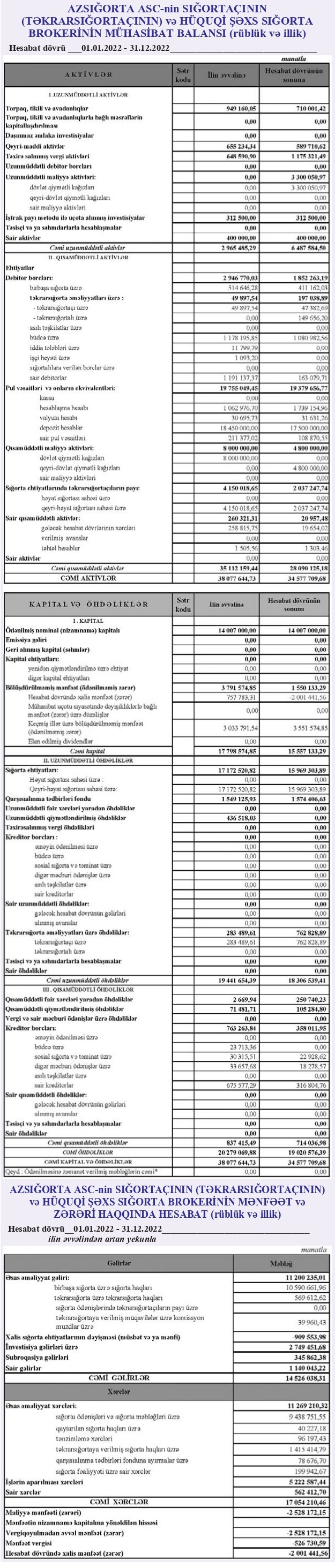 "AzSığorta" 2022-ci ili 2 milyon manatdan çox xalis zərər ilə başa vurub."AzSığorta" ASC 2022-ci ili 2 milyon 1 min manat xalis zərər ilə başa vurub. Şirkət 2021-ci ili 758 min manat xalis mənfəət ilə bağlamışdı.