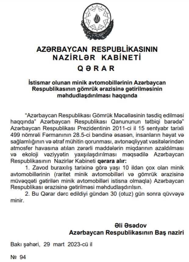 Qərara əsasən zavod buraxılış tarixinə görə yaşı 10 ildən çox olan minik avtomobillərinin Azərbaycan Respublikası ərazisinə gətirilməsi məhdudlaşdırılacaq.