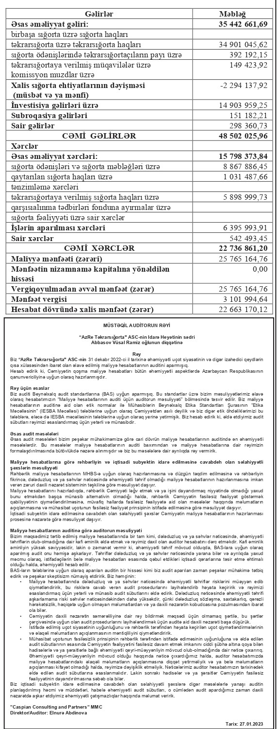 "AzRe Təkrarsığorta" topladığı təkrar sığorta haqları 2021-ci ildə 31 milyon 878 min manat ikən, 2022-ci ildə 34 milyon 901 min manat təşkil edib (9,5% artıb). Şirkətin investisiya gəlirləri 4 milyon 773 min manatdan 14 milyon 904 min manata yüksəlib (3,1 dəfə artıb).