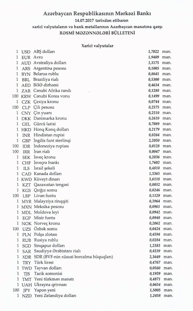 İyulun 14-nə Mərkəzi Bankın açıqladığı rəsmi Dollar/manat məzənnəsi İyulun 13-ü ilə müqayisədə qalxaraq 1,7022 manat olub, Avro/manat məzənnəsi isə 1.9409 manata düşüb.