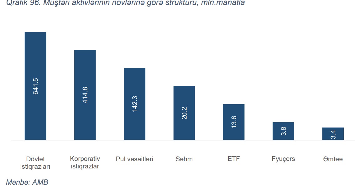 Müştəri aktivləri əsasən aşağı riskli qiymətli kağızlara investisiya olunub. Belə ki, 2022-ci ildə investorlar vəsaitlərinin 52%-ni (641.5 milyon manat) aşağı riskli qiymətli kağızlar hesab olunan dövlət istiqrazlarına, 33%-ni (414.8 milyon manat) korporativ istiqrazlara və 11%-ni (142.3 milyon manat) pul vəsaitlərinə yatırmışdır. Bazarda riskli yatırımların az olması fonunda törəmə maliyyə alətlərinə tələb az olmuşdur.