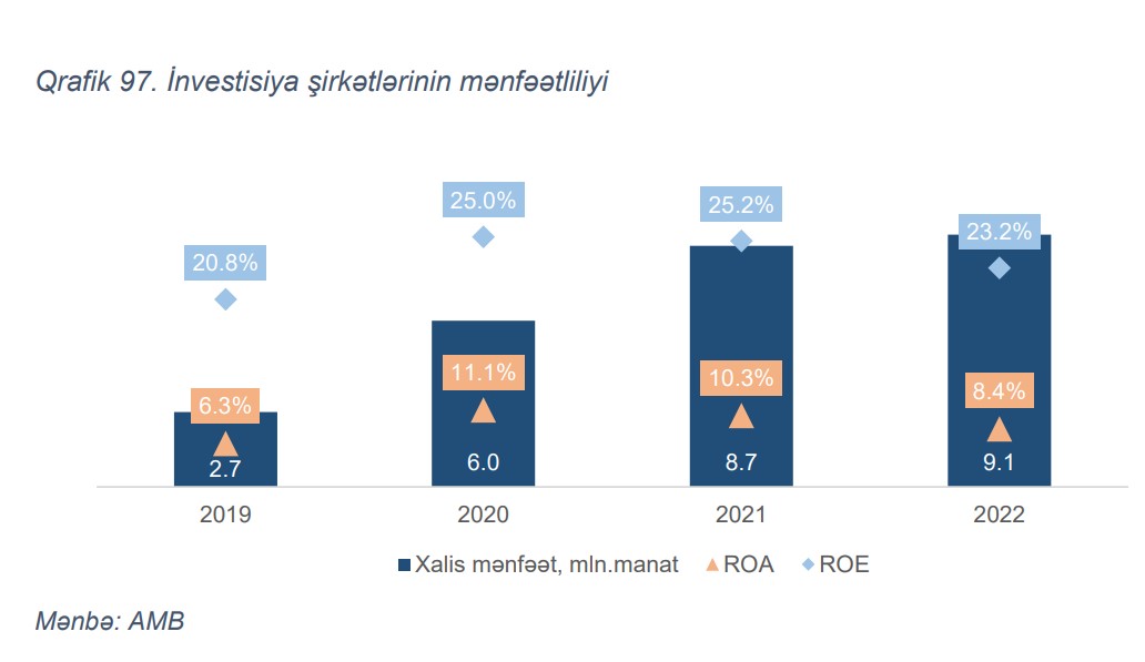 Hesabatda qeyd edilib ki, 2022- ci ildə investisiya şirkətlərinin xalis mənfəəti 4.6% və ya 0.4 milyon manat artaraq 9.1 milyon manat olmuşdur. Sektorun mənfəətliyində müsbət dinamika müşahidə edilsə də, aktivlər və kapital üzrə artım daha yüksək olmuşdur ki, bu da ROA və ROE göstəricilərinin müvafiq olaraq 23.2% və 8.4%-ə enməsinə səbəb olmuşdur.