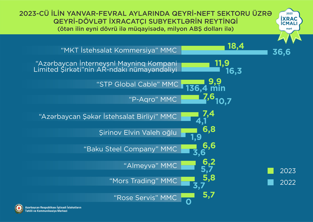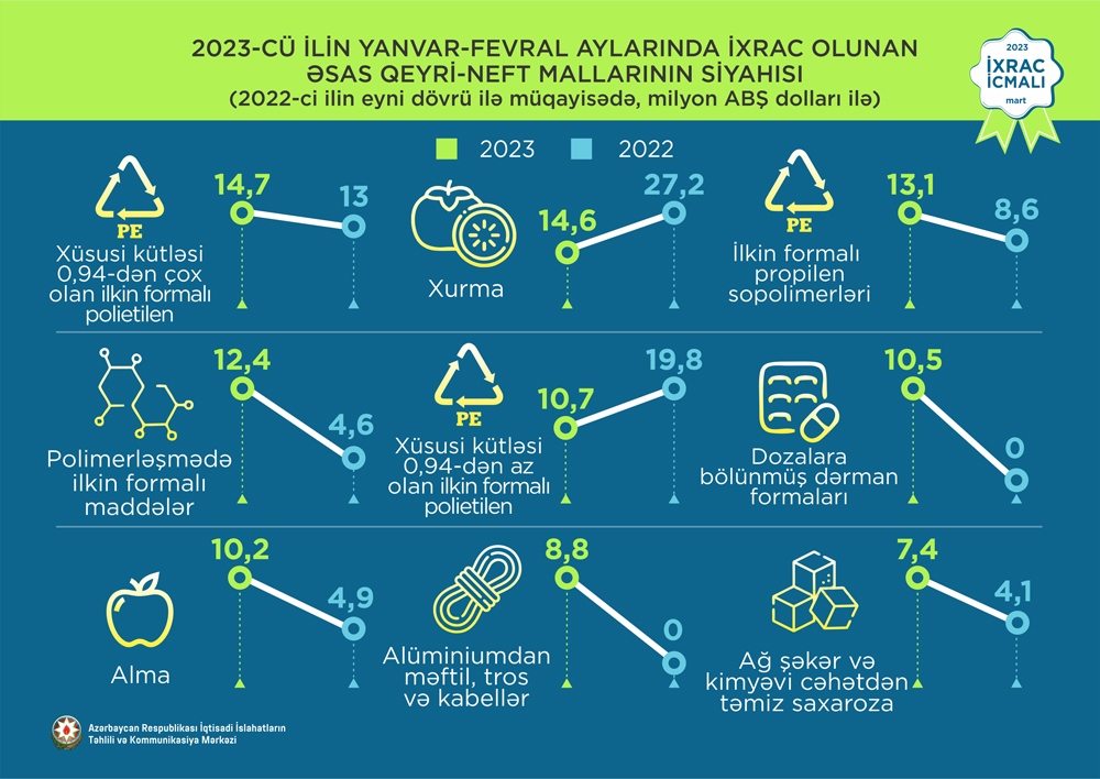 2023-ci ilin yanvar-fevral ayları ərzində Türkiyəyə 273,9 milyon ABŞ dolları, Rusiya Federasiyasına 137,7 milyon ABŞ dolları, Gürcüstana 64,7 milyon ABŞ dolları, Qazaxıstana 19,4 milyon ABŞ dolları və İsveçrə Konfederasiyasına isə 19 milyon ABŞ dolları dəyərində qeyri-neft sektoruna aid mal ixrac olunub.