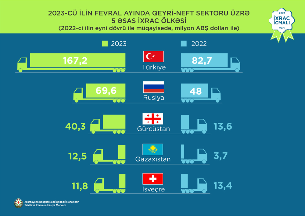 2023-cü ilin fevral ayında qeyri-neft sektoruna aid ən çox mal ixrac edilən ölkələrin siyahısında Türkiyə (167,2 milyon ABŞ dolları) birinciliyə yüksəlib. Bu siyahıda Rusiya Federasiyasına (69,6 milyon ABŞ dolları) ikinci və Gürcüstana (40,3 milyon ABŞ dolları) üçüncü olub.