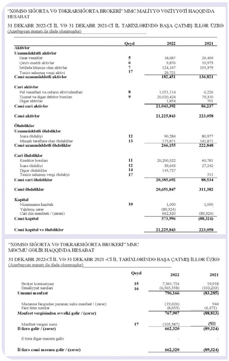 "Xəmsə Sığorta və Təkrarsığorta Brokeri" MMC 2022-ci ili 662 min 320 manat xalis mənfəət ilə başa vurub. Şirkət 2021-ci ili 89 min 324 manat xalis zərər ilə bağlamışdı.