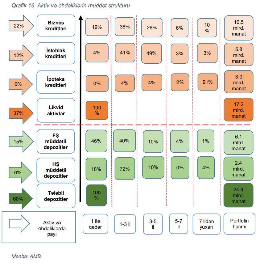 Öhdəliklərin tərkibi və müddət strukturu uzunmüddətli aktivlərin yaradılmasını məhdudlaşdırır. Biznes və istehlak kreditlərinin əsas hissəsi 5 ilədək verilən kreditlər təşkil etdiyi halda, depozitlər isə əsasən 1-3 il arasında yerləşdirilmişdir.