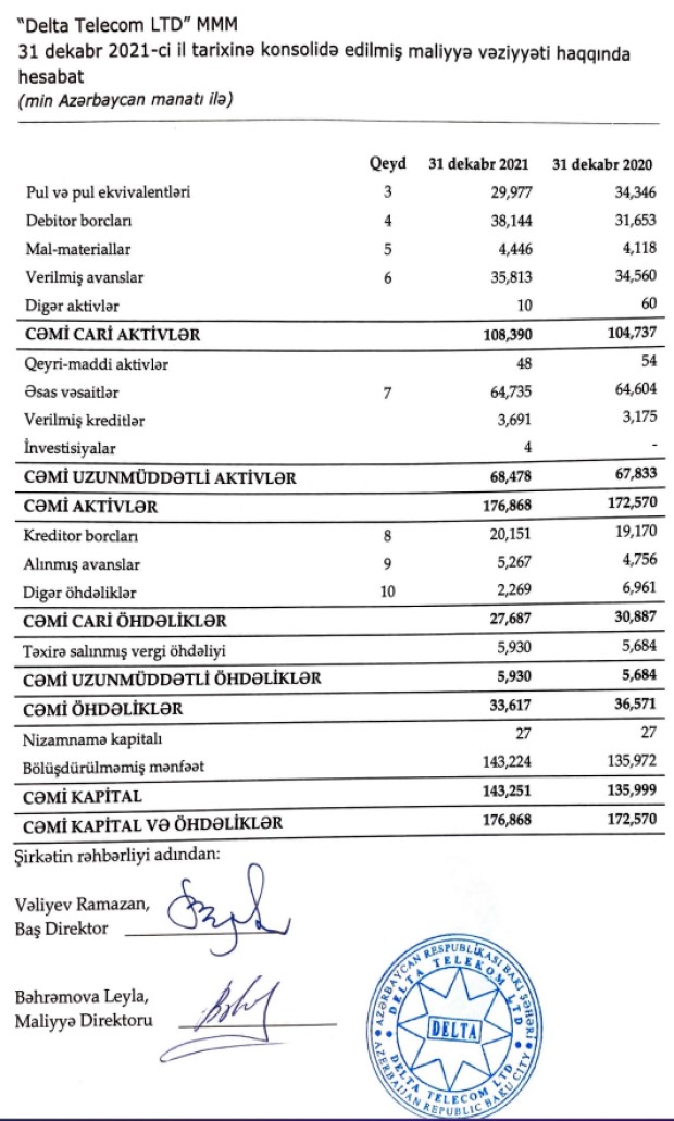 Belə ki, "Delta Telekom LTD" şirkətinin internet və digər xidmətlərdən gəlirləri 2020-ci ildəki 64 milyon 814 min manatdan 2021-ci ildə 65 milyon 851 manaat yüksəlib, avadanlığın satışından gəliri 2 milyon 131 min manatdan 206 min manata düşüb. Şirkət 2021-ci ildə icarədən 325 min manat gəlir əldə edib (2020-ci ildə 288 min manat).
