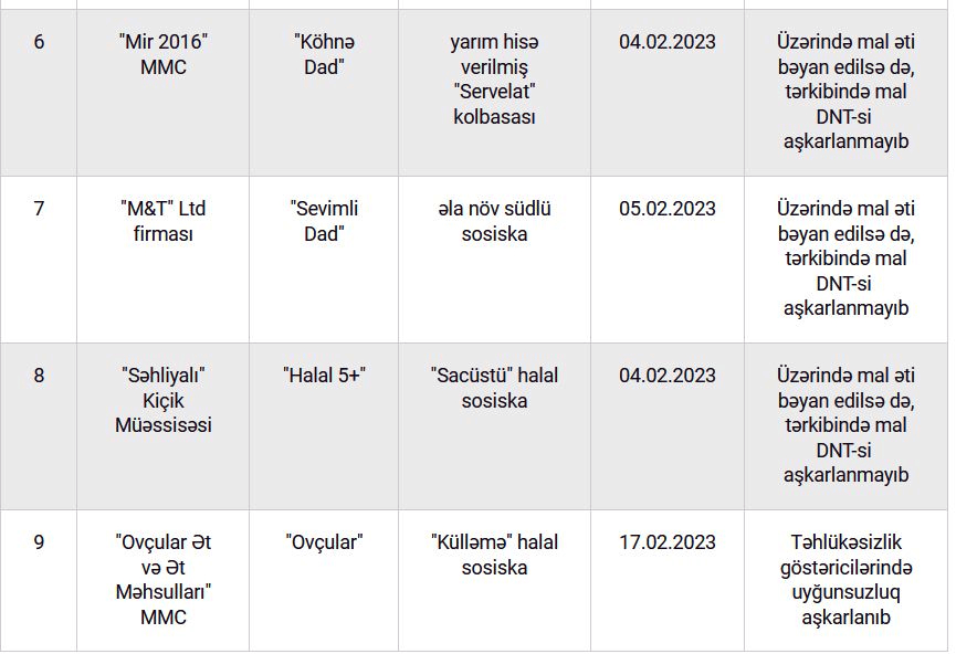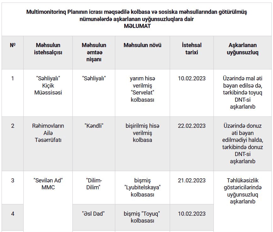 "Səhliyalı" Kiçik Müəssisəsi, Rəhimovların Ailə Təsərrüfatı, "Sevilən Ad" MMC və "Ovçular Ət və Ət Məhsulları" MMC-nin kolbasa və sosiska məhsullarında uyğunsuzluq aşkarlanıb.Azərbaycan Respublikasının Qida Təhlükəsizliyi Agentliyi tərəfindən ölkədə qida təhlükəsizliyinə risk əsaslı yanaşmanın tətbiqi ilə mövcud problemlərin, o cümlədən baş verən zəhərlənmə halları və daxil olan istehlakçı şikayətlərinə dair məlumat bazasının təhlili nəticəsində bir sıra qida təhlükəsizliyi problemlərinin müəyyənləşdirilərək müvafiq addımların atılması məqsədilə hazırlanan Multimonitorinq Planının icrası davam etdirilir.