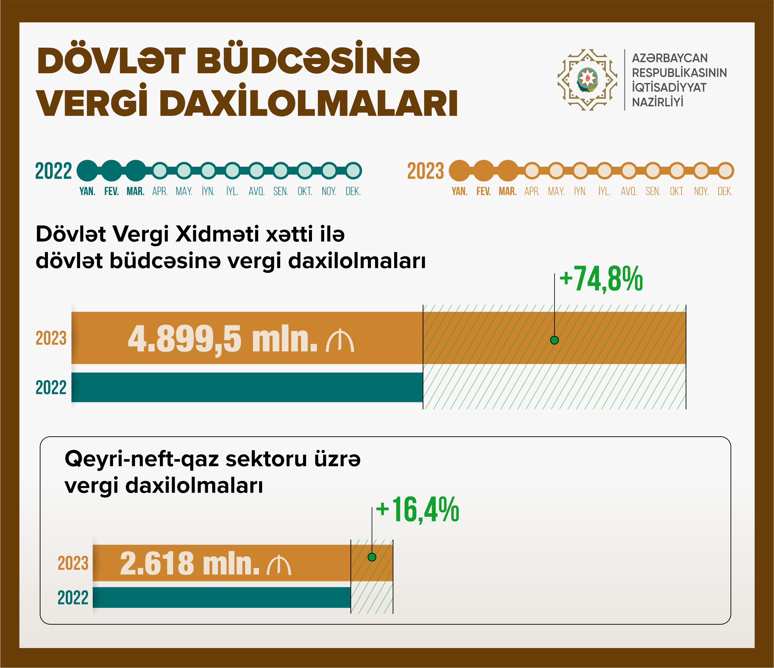 2023-cü ilin yanvar-mart aylarında Dövlət Vergi Xidməti xətti ilə dövlət büdcəsinə vergi daxiolmalarının həcmi 2022-ci ilin müvafiq dövrü ilə müqayisədə 74,8% artaraq 4 milyard 899,5 milyon manat təşkil edib.