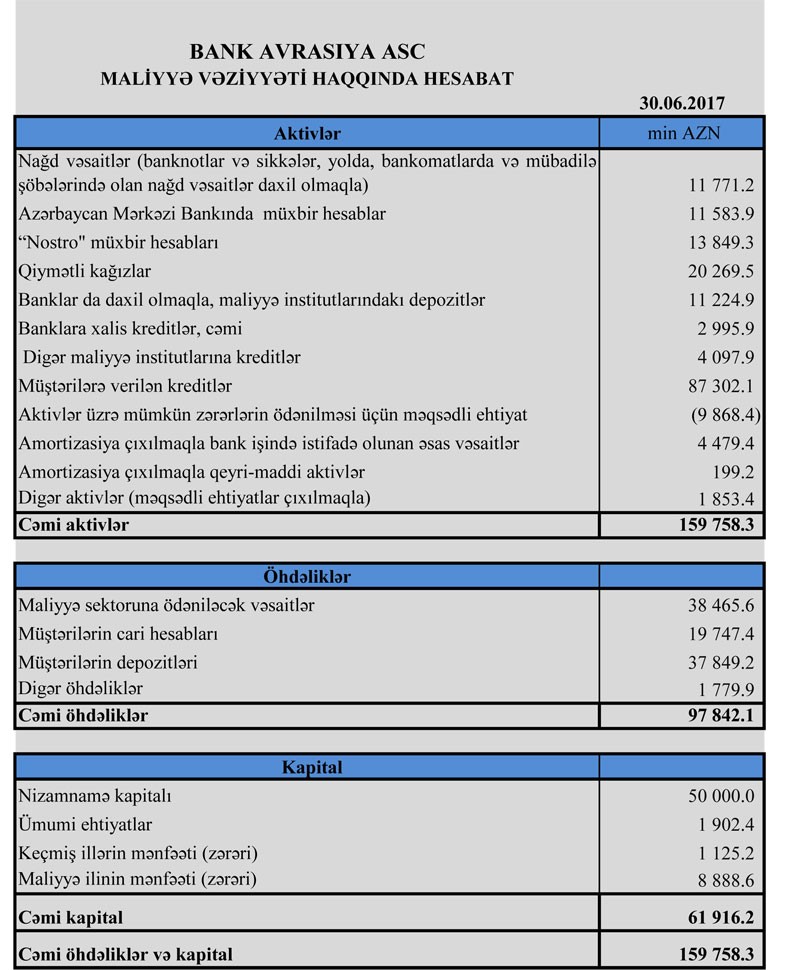“Bank Avrasiya” ASC 30 İyun 2017-ci il tarixində 159,8 milyon manat cəmi aktivlərə, 97,8 milyon manat cəmi öhdəliklərə və 61,9 milyon manat cəmi balans kapitalına malik olub. Bank ötən ilin sonunda 143,4 milyon manat cəmi aktivlərə, 90,8 milyon manat cəmi öhdəliklərə və 52,6 milyon manat cəmi kapitala malik idi.