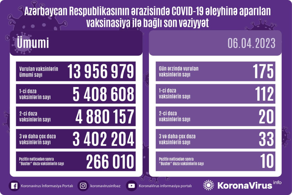 Azərbaycanda son sutkada koronavirus (COVID-19) əleyhinə 175 vaksin vurulub. Bir gündə birinci mərhələ üzrə vaksinasiya olunanların sayı 112, ikinci mərhələ üzrə vaksinasiya olunanların sayı 20, üç və daha çox doza üzrə vaksinasiya olunanların sayı 33, pozitiv nəticədən sonra buster doza üzrə vaksinasiya olunanların sayı 10 nəfərdir.