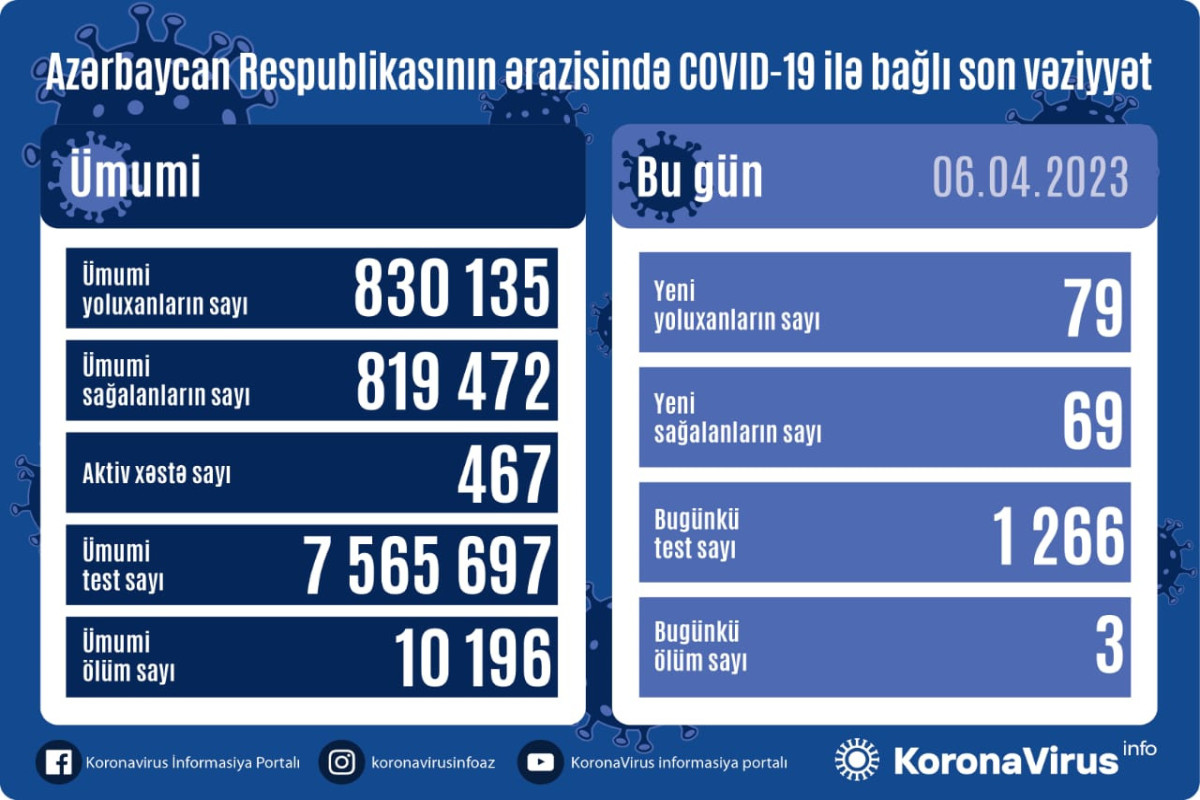 Azərbaycan Respublikasında koronavirus (COVID-19) infeksiyasına 79 yeni yoluxma faktı qeydə alınıb, 69 nəfər müalicə olunaraq sağalıb.