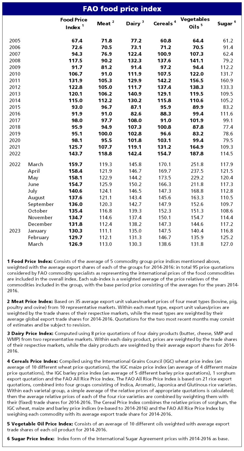 "İndeks 2023-cü ilin mart ayında orta hesabla 126,9 bənd təşkil edərək, fevral ayına nisbətən 2,8 bənd (2,1 faiz) azalıb. FFPI bir il əvvəl pik həddinə çatdıqdan sonra ardıcıl on ikinci aydır enişi qeyd edir. 2022-ci ilin martından bu yana keçən on iki ay ərzində indeks 32,8 bənd (20,5 faiz) azalıb. Mart ayında indeksin azalmasına dənli bitkilərin, bitki yağı və süd məhsullarının qiymət indekslərindəki geriləmə səbəb olub. Şəkər və ətin qiymətlərində isə artım olub",- FAO bildirib.