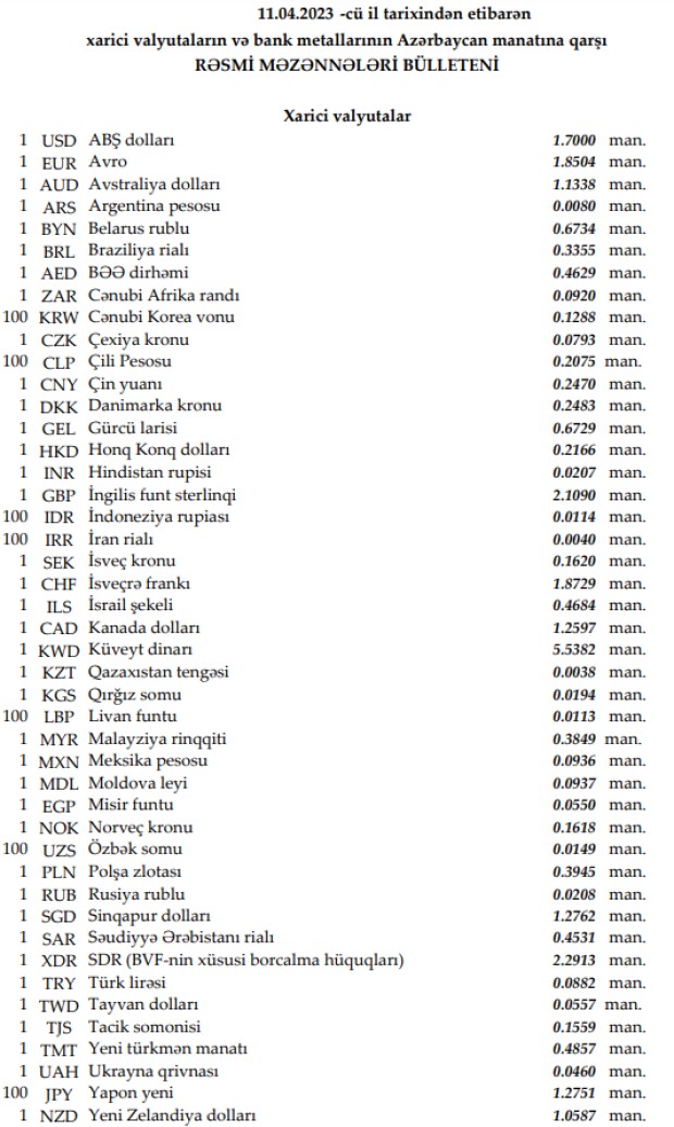 Rəsmi məzənnələr açıqlandı