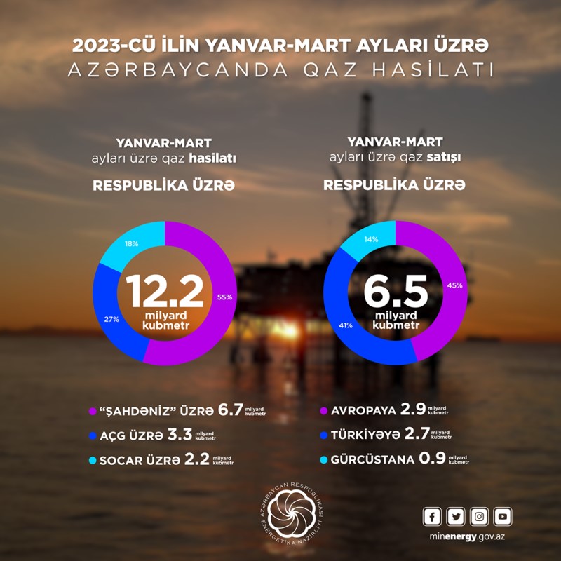 2023-cü ilin 1-ci rübündə qaz hasilatı 3 faiz artıbEnergetika Naziriyinin yaydığı məlumatda bildirilir ki, 2023-cü ilin yanvar-mart ayları üzrə operativ məlumatlara əsasən, Azərbaycanda 12,2 milyard kubmetr təbii qaz hasil edilib. Qazın 3,3 milyard kubmetri “Azəri-Çıraq-Günəşli”dən, 6,7 milyard kubmetri “Şahdəniz”dən, 2,2 milyard kubmetri SOCAR üzrə hasil olunub. Ötən ilin müvafiq dövrünə nisbətən 3 faiz, yəni 356 milyon kubmetr artımla qaz hasil edilib.