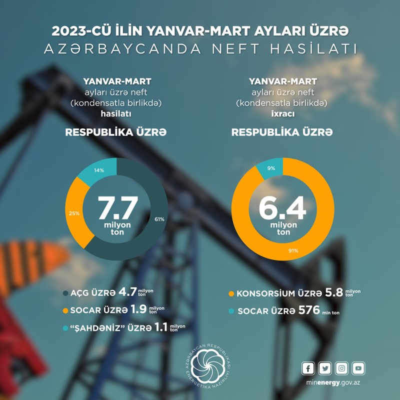 2023-cü ilin 1-ci rübü üzrə ölkədə 7,7 milyon ton neft (kondensatla birlikdə) hasil edilib. Respublika üzrə neft hasilatının 4,7 milyon tonu “Azəri-Çıraq-Günəşli”nin, 1,1 milyon tonu (kondensat) “Şahdəniz”in payına düşüb. SOCAR üzrə neft (kondensatla birlikdə) hasilatı 1,9 milyon ton təşkil edib.