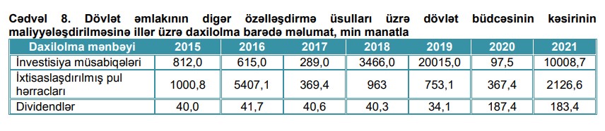 Marja.az bülletenə istinadən verdiyi məlumata görə, 2020-ci ildə dövlət büdcəsi kəsirinin maliyyələşdirilməsinə özəlləşdirmə prosesində yaradılmış və səhmləri bütövlükdə yaxud səhmlərinin bir hissəsi dövlətə məxsus olan səhmdar cəmiyyətlər tərəfindən dövlət büdcəsinə dividendlərin ödənilməsi üzrə 187,4 min manat, 2021-ci ildə isə 11 dövlət müəssisəsindən ümumilikdə 183,4 min manat vəsait daxil olmuşdur.