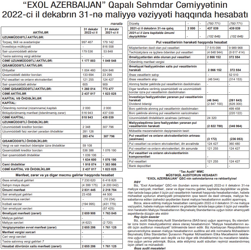 Marja.az xəbər verir ki, 2021-ci ildə "Exol Azerbaijan" şirkətinin əsas əməliyyat gəlirləri (satış) 6 milyon 419 min manat ikən, 2022-ci ildə 7 milyon 231 min manata yüksəlib (12,6% artıb).