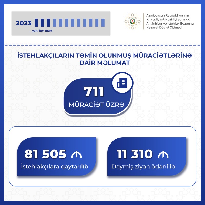 2023-cü ilin 1-ci rübü ərzində istehlakçı hüquqlarının müdafiəsi ilə bağlı təmin olunmuş 711 müraciət üzrə 81 min 505 manat vəsait istehlakçılara geri qaytarılıb,