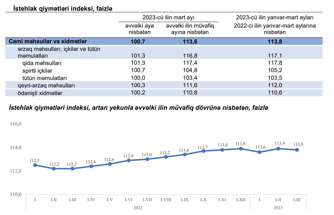 Dövlət Statistika Komitəsinin yaydığı məlumata görə, 2023-cü ilin mart ayında istehlak qiymətləri indeksi əvvəlki aya nisbətən 0,7 faiz, əvvəlki ilin mart ayına nisbətən 13,6 faiz yüksəlib.