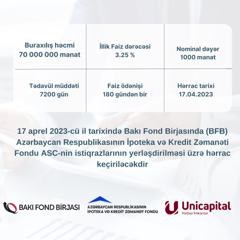 17 aprel 2023-cü il tarixində Bakı Fond Birjasında (BFB) Azərbaycan Respublikasının İpoteka və Kredit Zəmanəti Fondu ASC-nin istiqrazlarının yerləşdirilməsi üzrə hərrac keçiriləcəkdir.