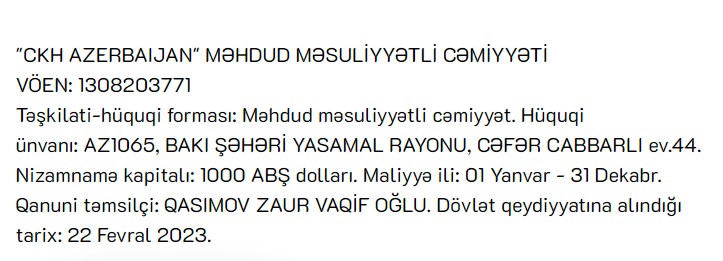 Dövlət Vergi Xidməti "CKH Azerbaijan" MMC şirkətini dövlət qeydiyyatına alıb. CKH ABŞ-ın beynəlxalq nüfuzlu konsaltinq şirkətidir.