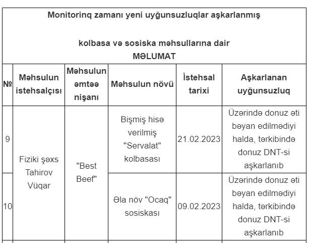Marja.az xəbər verir ki, Vüqar Tahirovun istehsal etdiyi "Best Beef" markalı bişmiş hisə verilmiş "Servalat" kolbasasında və əla növ "Ocaq" sosiskasında, "üzərində donuz əti bəyan edilmədiyi halda, tərkibində donuz DNT-si aşkarlanıb".