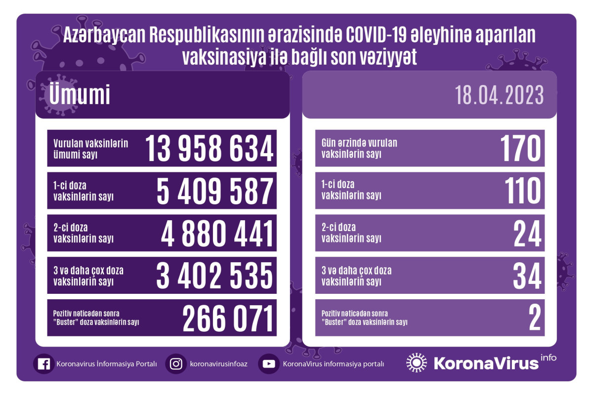 Azərbaycanda son sutkada koronavirus (COVID-19) əleyhinə 170 vaksin vurulub. Bir gündə birinci mərhələ üzrə vaksinasiya olunanların sayı 110, ikinci mərhələ üzrə vaksinasiya olunanların sayı 24, üç və daha çox doza üzrə vaksinasiya olunanların sayı 34, pozitiv nəticədən sonra buster doza üzrə vaksinasiya olunanların sayı 2 nəfərdir.
