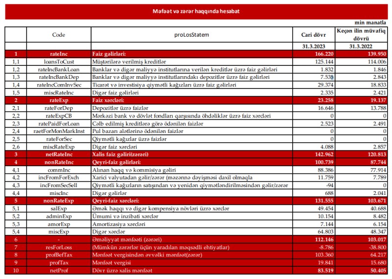 İri bank 3 ayda 83,5 milyon manat mənfəət əldə edib
