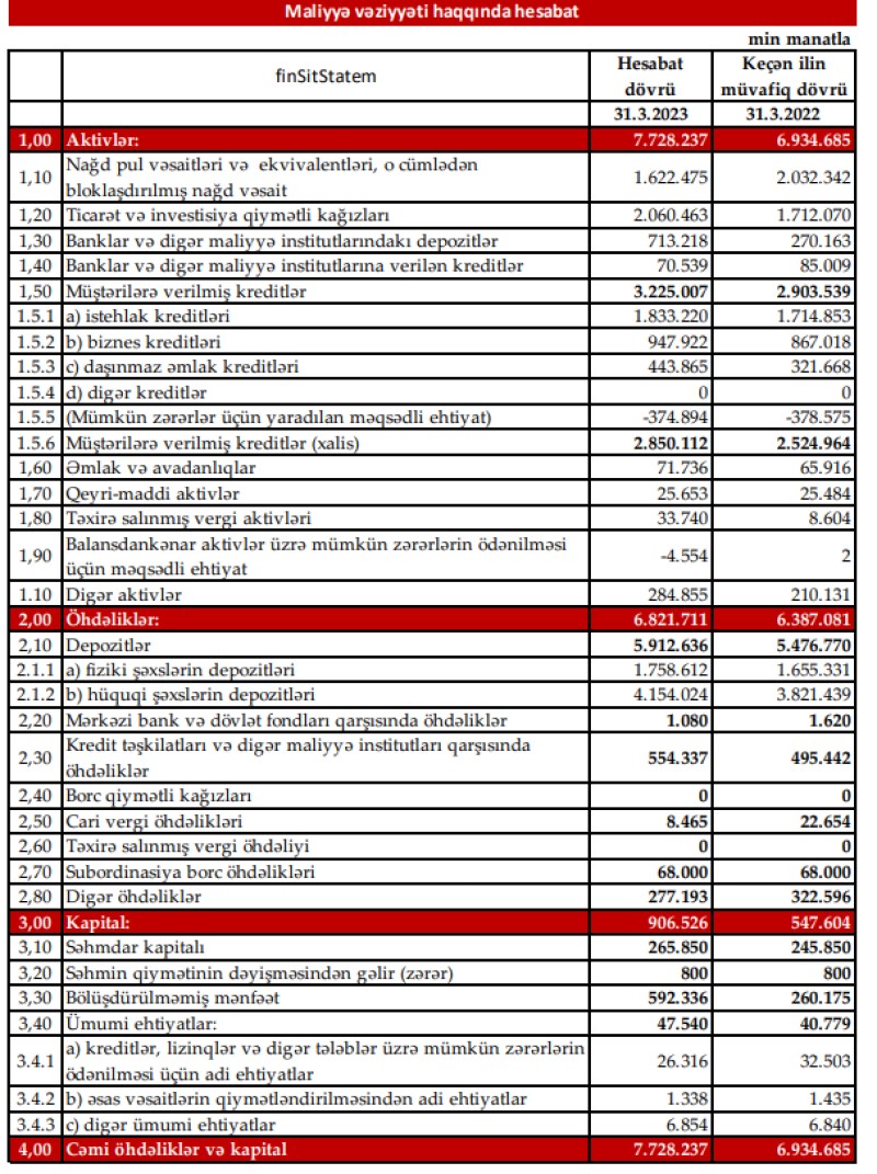 AKTİVLƏRİ 7,7 MİLYARD MANATDAN, KREDİT PORTFELİ 3,2 MİLYARD MANATDAN ÇOXDUR