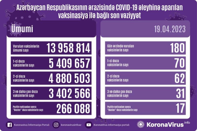 Nazirlər Kabineti yanında Operativ Qərargahdan verilən məlumata görə, bir gündə birinci mərhələ üzrə vaksinasiya olunanların sayı 70, ikinci mərhələ üzrə vaksinasiya olunanların sayı 62, üç və daha çox doza üzrə vaksinasiya olunanların sayı 31, pozitiv nəticədən sonra buster doza üzrə vaksinasiya olunanların sayı 17 nəfərdir.