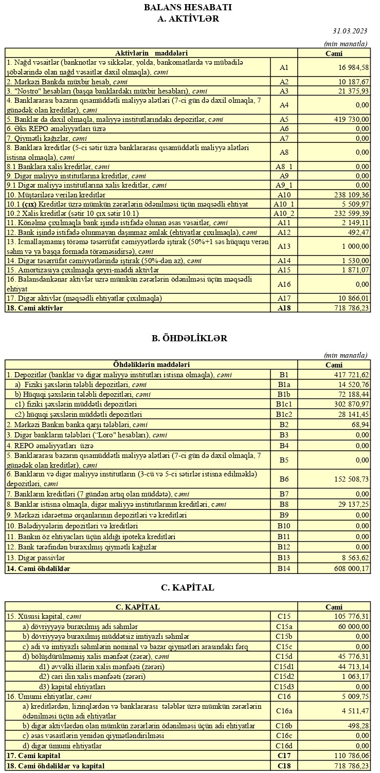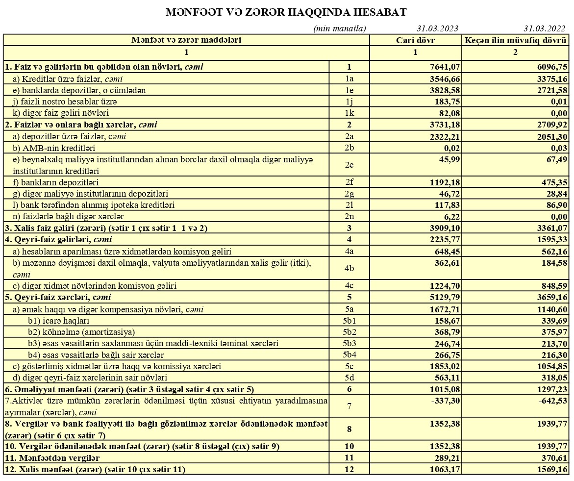 "Azərbaycan Sənaye Bankı" ASC (ASB) 2023-cü ilin 1-ci rübünü (yanvar-mart) 1 milyon 63 min manat xalis mənfəət ilə başa vurub.