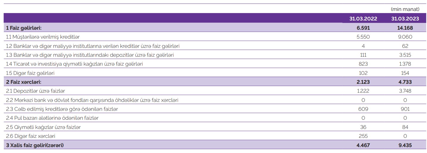 Cari ilin birinci rübü ərzində Bankın gəlirləri keçən ilin eyni dövrü ilə müqayisədə 115% yüksəlməklə 20,9 milyon manat, xərcləri 17,7 milyon manat olmuşdur.