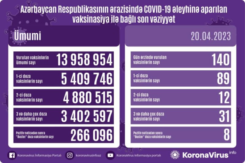 Azərbaycanda son sutkada koronavirus (COVID-19) əleyhinə 140 vaksin vurulub. Bir gündə birinci mərhələ üzrə vaksinasiya olunanların sayı 89, ikinci mərhələ üzrə vaksinasiya olunanların sayı 12, üç və daha çox doza üzrə vaksinasiya olunanların sayı 31, pozitiv nəticədən sonra buster doza üzrə vaksinasiya olunanların sayı 8 nəfərdir.