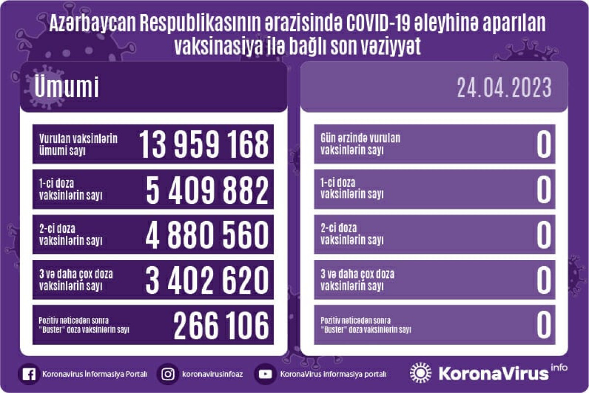 Azərbaycanda son sutkada koronavirus (COVID-19) əleyhinə peyvənd aparılmayıb.