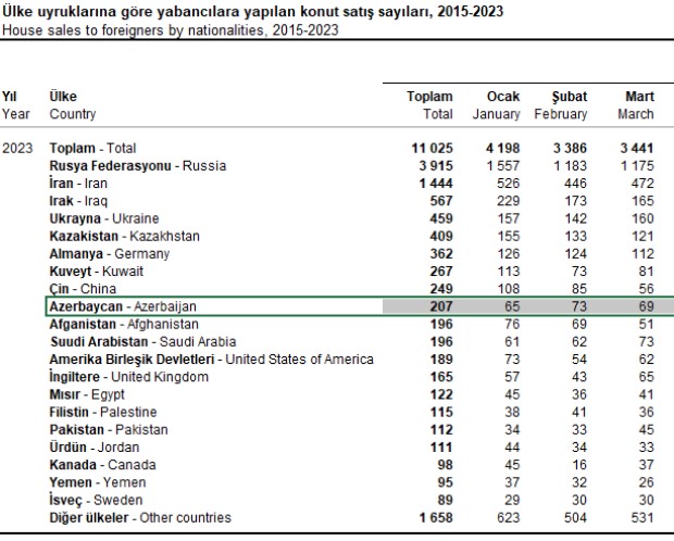 2023-cü ilin ilk 3 ayında (yanvar-mart) Azərbaycan vətəndaşları Türkiyədə 207 mənzil (ev) alıblar. Halbuki, azərbaycanlılar 2022-ci ilin eyni dövründə qardaş ölkədə 297 evə sahib olmuşdular.