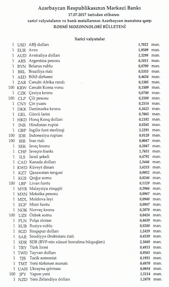 İyulun 17-nə Mərkəzi Bankın açıqladığı rəsmi Dollar/manat məzənnəsi İyulun 14-ü ilə müqayisədə dəyişməyərək 1,7022 manat olub, Avro/manat məzənnəsi isə 1.9509 manata qalxıb.