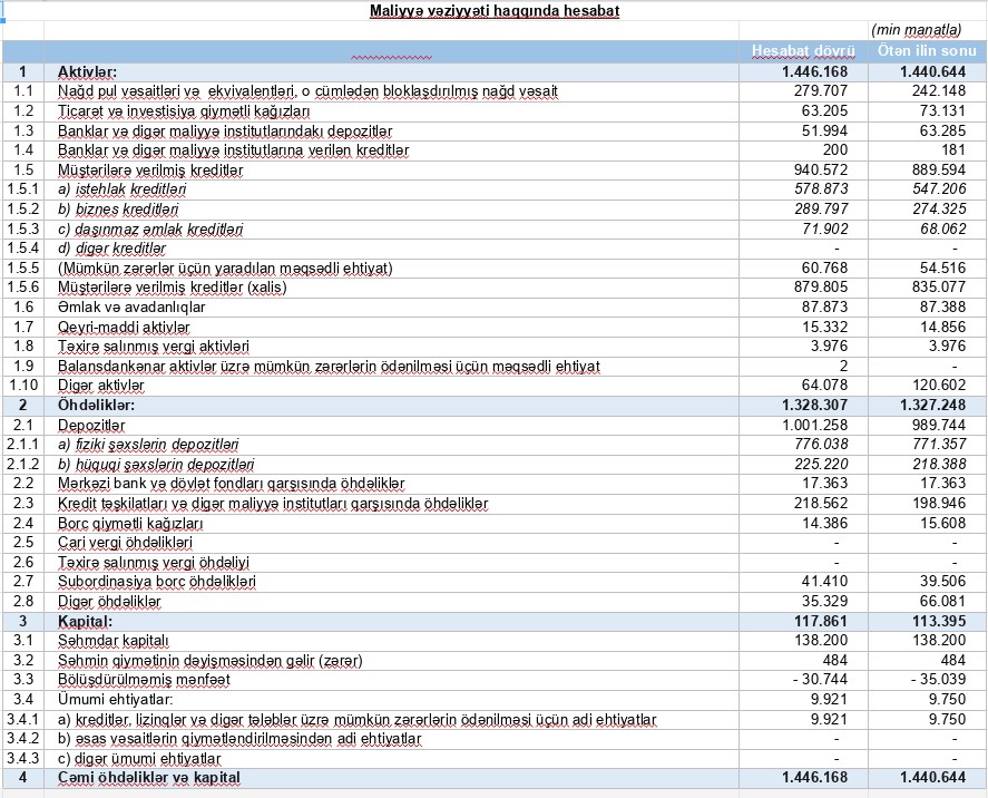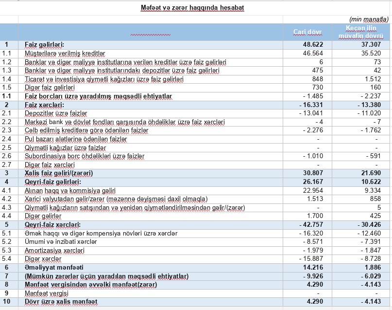 “Unibank” Kommersiya Bankı ASC 2023-cü ilin 1-ci rübünü (yanvar-mart) 4 milyon 290 milyon manat xalis mənfəət ilə başa vurub. Bank ötən ilin eyni dövrünü, mümkün zərərlər üçün yaradılan məqsədili ehtiyatlara vəsait ayırması ilə əlaqədar olaraq 4 milyon 143 min manat xalis zərər ilə bağlamışdı. İlk rübdə “Unibank”, gəlirlərinin artması hesabına xalis mənfəət əldə edib.