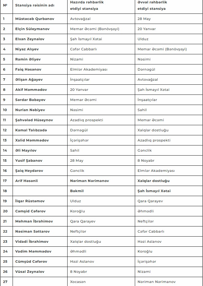 Bakı metrosunun 26 stansiyasında rəislər dəyişdirilib