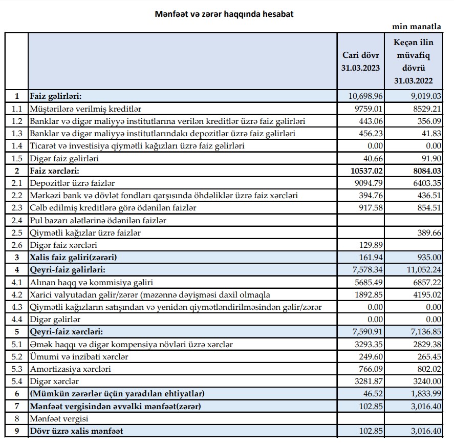 Məlumatda bildirilir ki, Bankın faiz gəlirləri 18,63% artaraq 10,70 milyon manat təşkil edib.