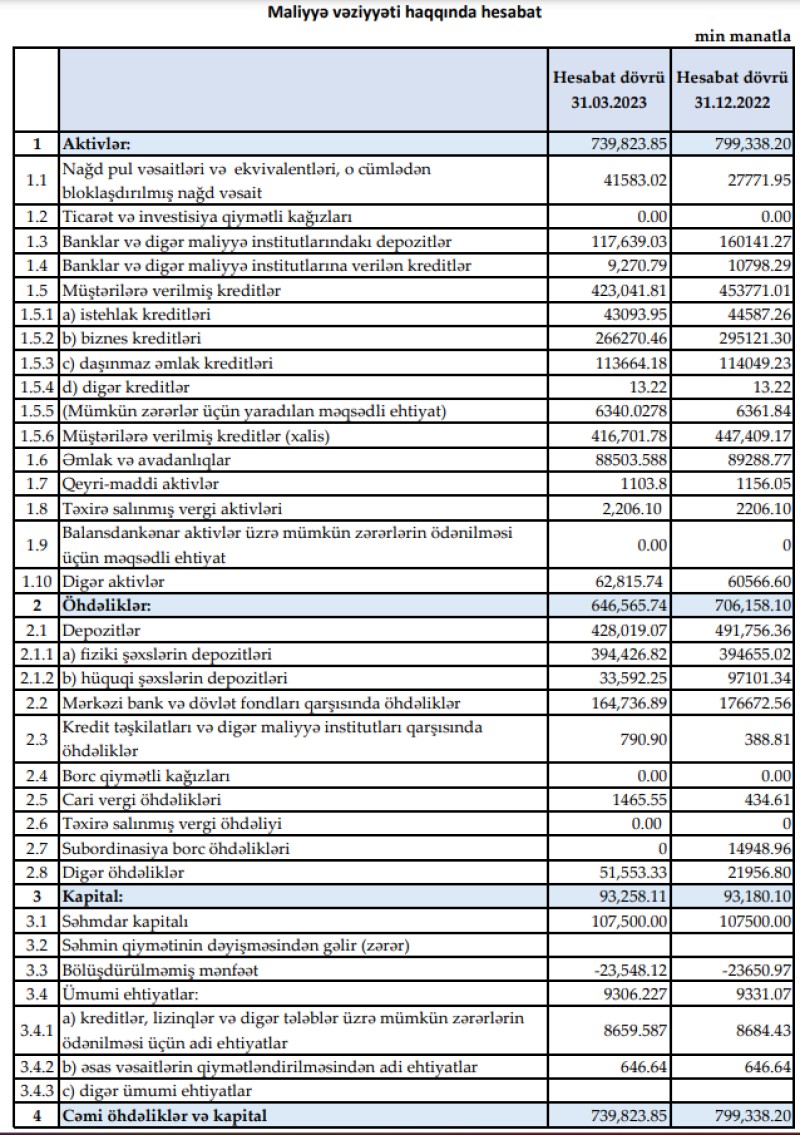 Ötən ilin analoji dövrü ilə müqayisədə Bankın cəmi aktivləri əhəmiyyətli dərəcədə olmaqla, 11,65% artımla 739,82 milyon manat təşkil edib. bankın cəmi depozit portfelində də 31,51% artım qeydə alınaraq 428,02 milyon manata çatıb.