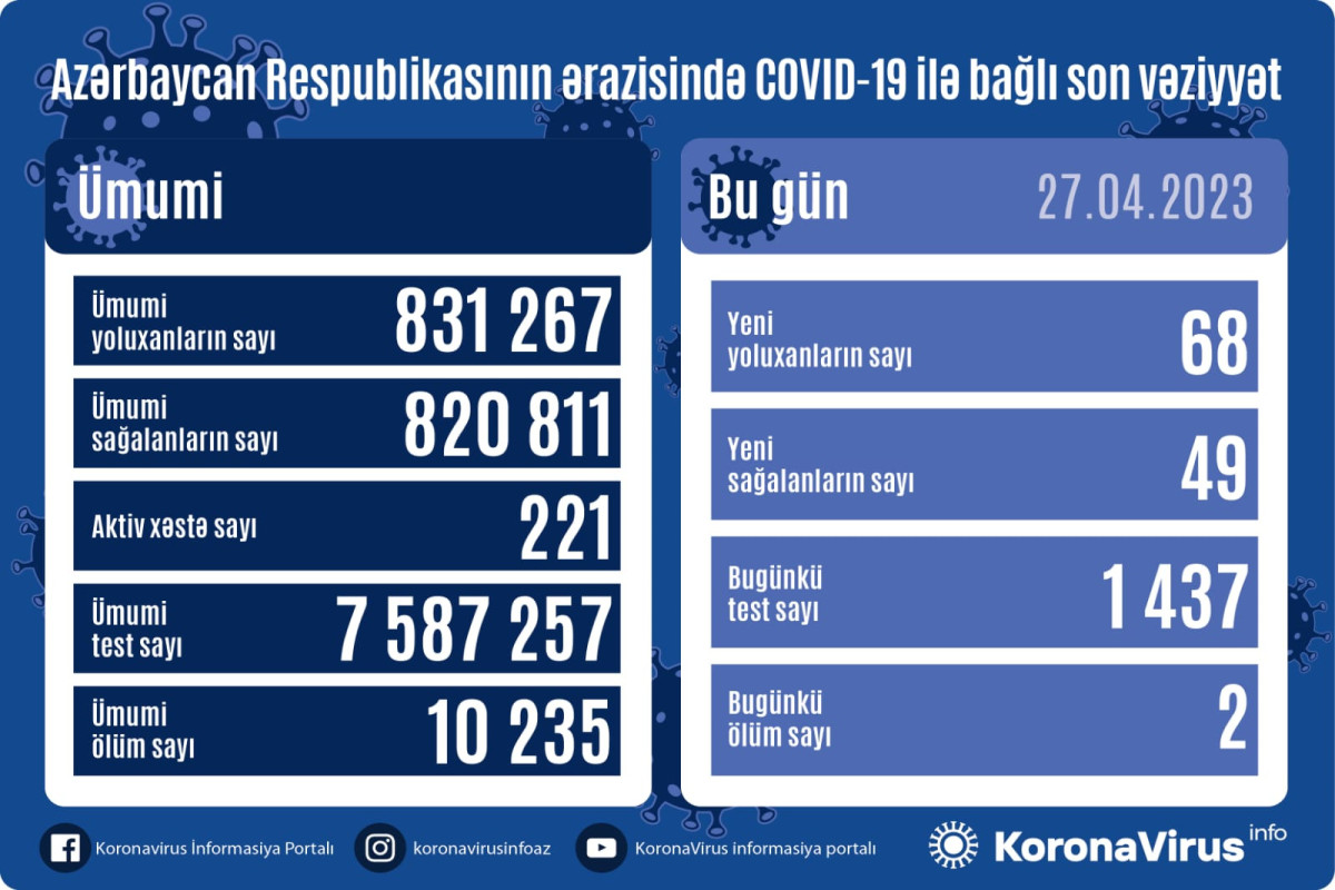 Azərbaycan Respublikasında koronavirus (COVID-19) infeksiyasına 68 yeni yoluxma faktı qeydə alınıb, 49 nəfər müalicə olunaraq sağalıb.