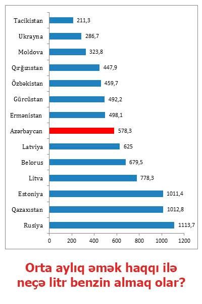 Göründüyü kimi, Azərbaycan nəinki neft ölkəsi olan Rusiya və Qazaxıstana, hətta neftdən asılı olan Belorus və Baltik ölkələrinə də uduzur. Rusiya və Qazaxıstandakı orta aylıq maaşla Azərbaycanda 2 dəfə çox benzin almaq olar. Cənubi Qafqaz ölkələrini isə cüzi qabaqlayır. Tacikistan, Ukrayna və Moldova ilə müqayisədə ucuz benzin almağımıza görə sevinə bilərik. İndi siz deyin, benzin bizdə bahadır yoxsa ucuz?