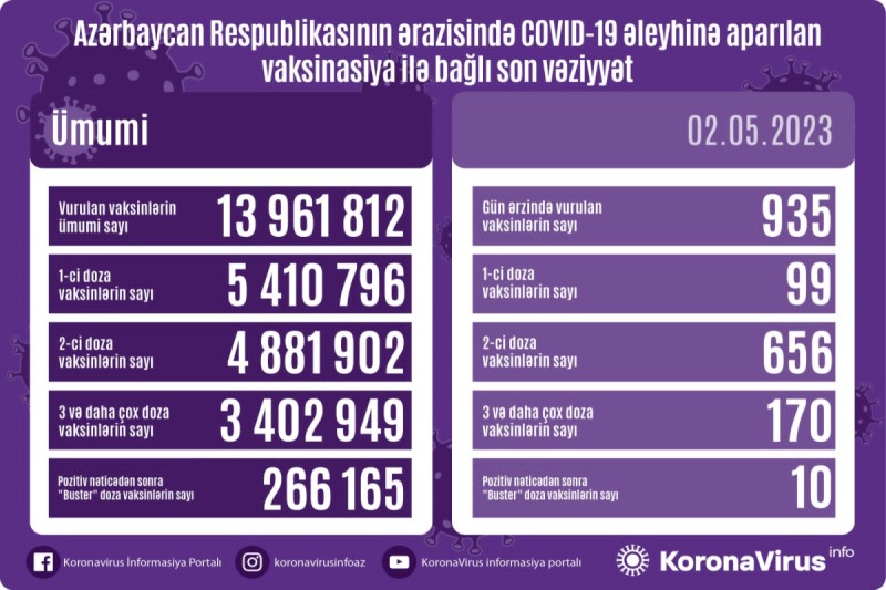 Azərbaycanda son sutkada koronavirus (COVID-19) əleyhinə 935 vaksin vurulub. Bir gündə birinci mərhələ üzrə vaksinasiya olunanların sayı 99, ikinci mərhələ üzrə vaksinasiya olunanların sayı 656, üç və daha çox doza üzrə vaksinasiya olunanların sayı 170, pozitiv nəticədən sonra buster doza üzrə vaksinasiya olunanların sayı 10 nəfərdir.